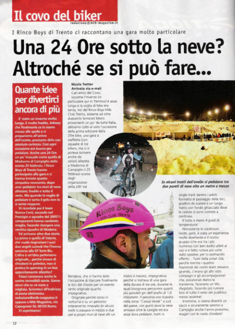 Trento, 05/05/2005. Bella sorpresa quella trovata oggi dai Rinco Boys tra le pagine del mensile specializzato MTB Magazine. Nella rubrica "Il covo del biker", l'intera pag.12 è infatti dedicata alla partecipazione del Club, il 25 febbraio scorso, alla 3tre bike, la staffetta in notturna sulla neve disputata a Madonna di Campiglio.