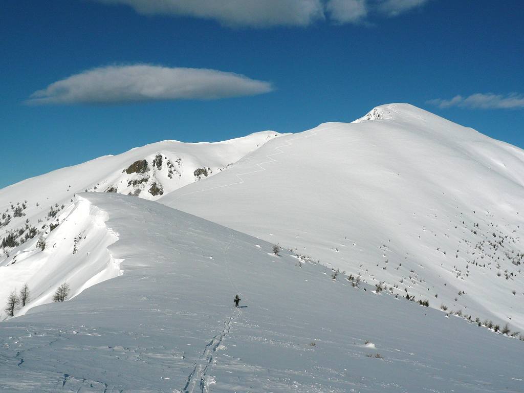 Gran bella giornata di sole, con temperatura assai mite sul mezzogiorno (-5°, invece, alla partenza alle 9:00), ma manto nevoso ormai ridotto al lumicino, con ampi tratti dove si è camminato addirittura sul terreno scoperto. Insomma, l'effetto della nevicata di una settimana fa è già svanito, a causa delle temperature decisamente poco invernali degli ultimi giorni.