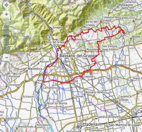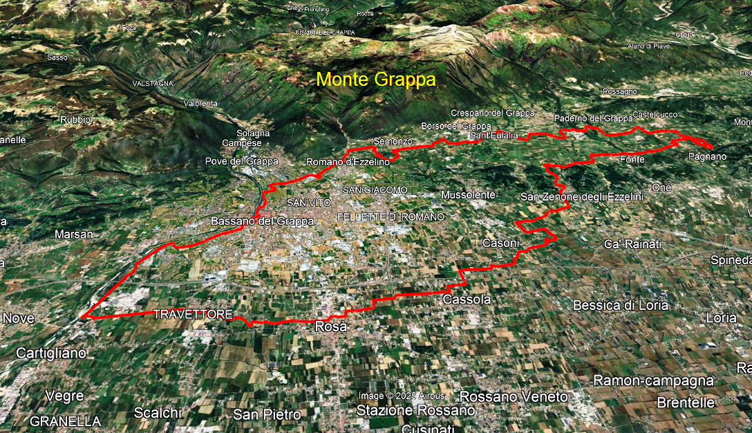 Giunti al fiume Brenta, si è risaliti fino a Bassano, con immancabile passaggio in centro, per poi tornare verso la Pedemontana e chiudere l'anello di circa 60 km nuovamente a Borso.