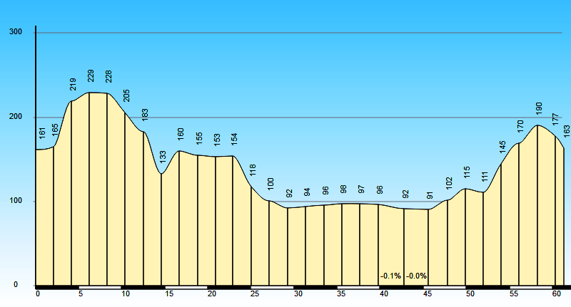 Complessivamente sono stati percorsi circa 61 km, mentre il dislivello superato è stato di circa 420 metri. Altimetria senza particolari asperità, con sviluppo collinare nella prima parte (salite brevi) e abbastanza pianeggiante nei successivi km. Leggera salita nel finale, per tornare a Borso dal fiume Brenta. GPM sulle colline della Pedemontana, m. 230.