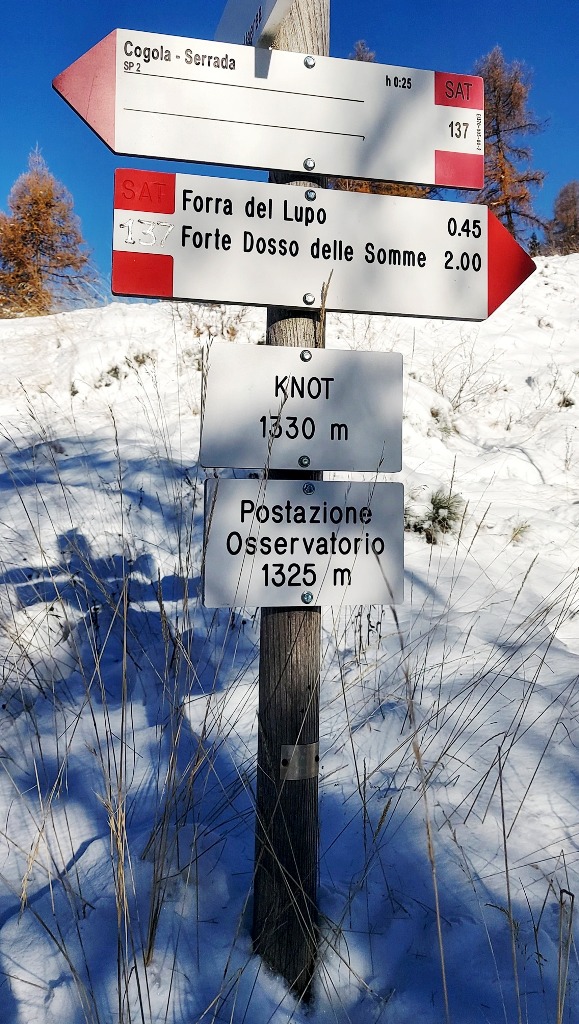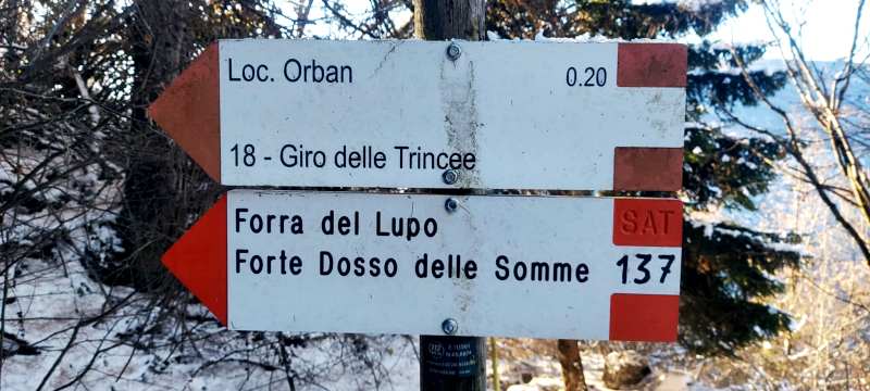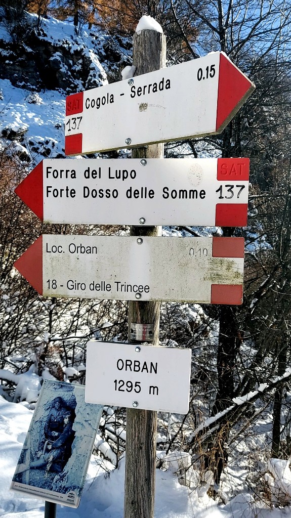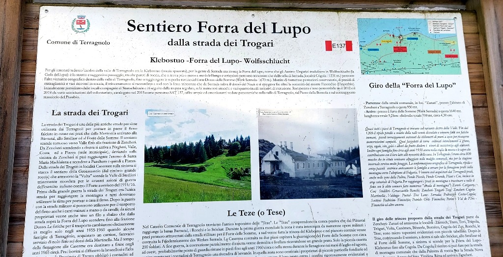 La partenza è avvenuta dal parcheggio Cogola, in loc. Serrada. Da qui è stato imboccato il sentiero 137 che dopo un breve tratto in leggera discesa si infila subito nei vecchi camminamenti militari che gli austriaci avevano realizzato per collegare fra loro le numerosi postazioni armate dislocate sul versante nord della Val di Terragnolo, possibile punto di attacco italiano dal valico di passo Borcola.