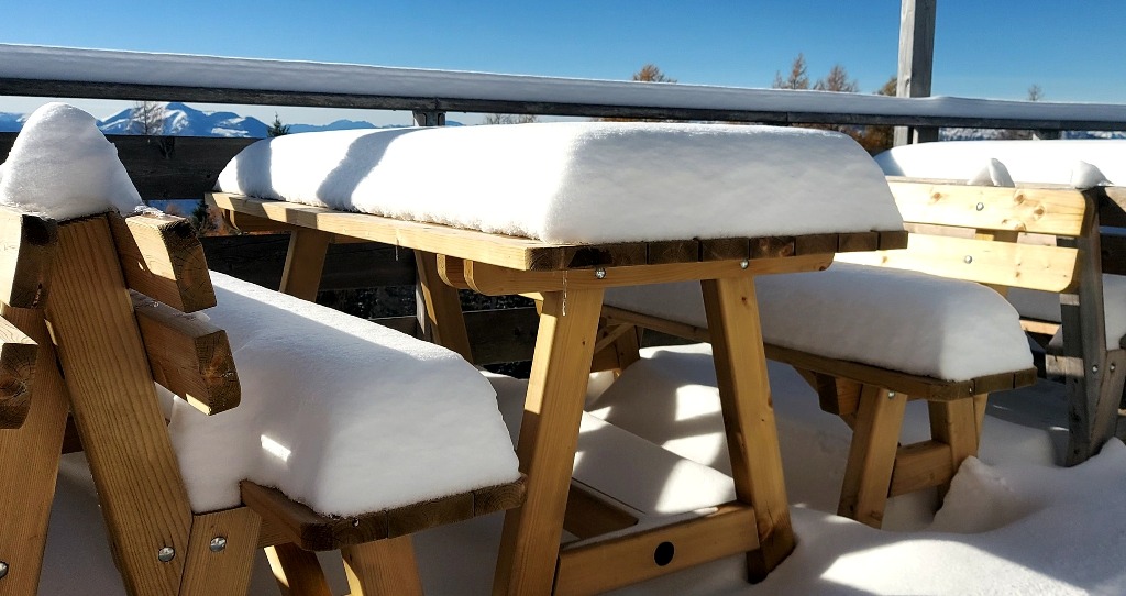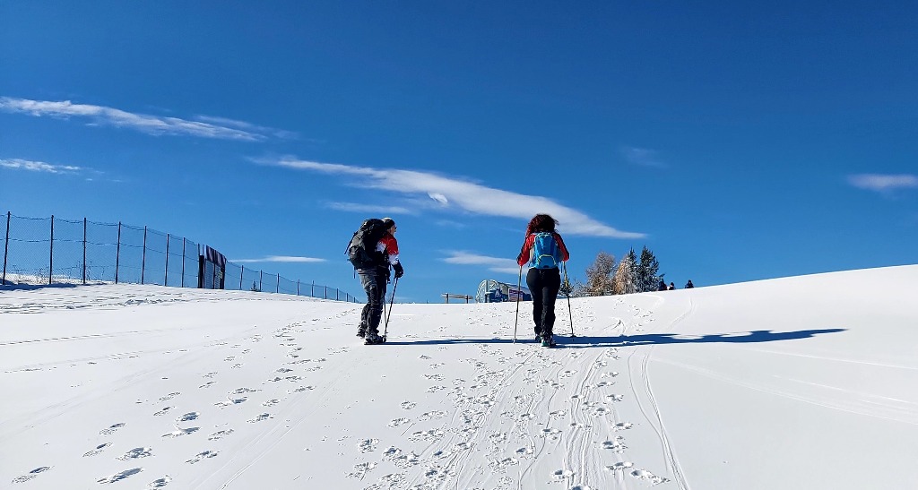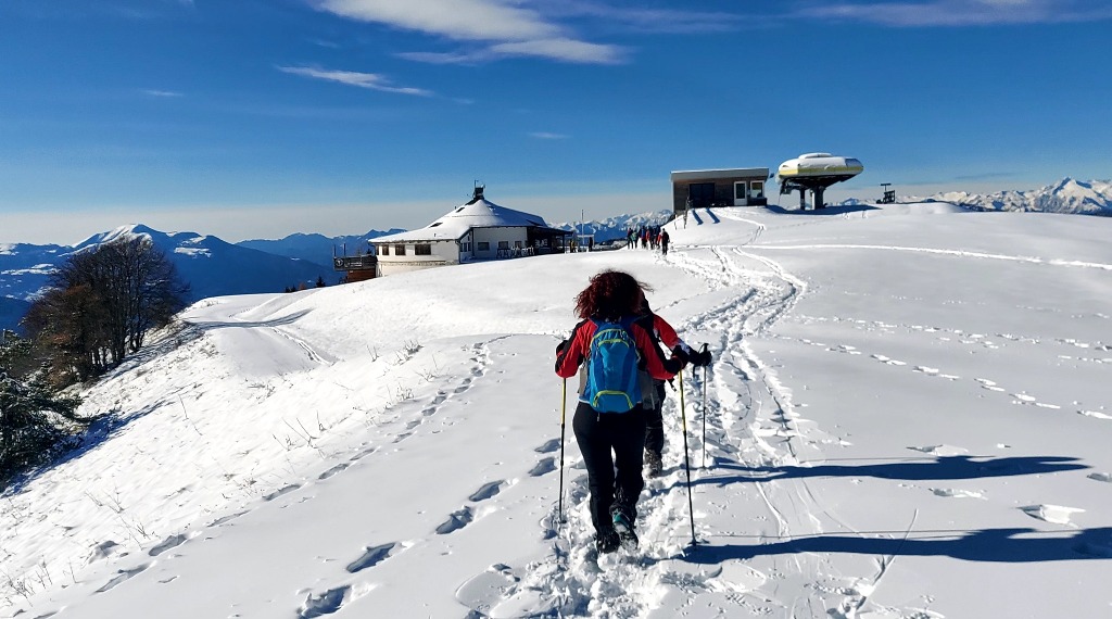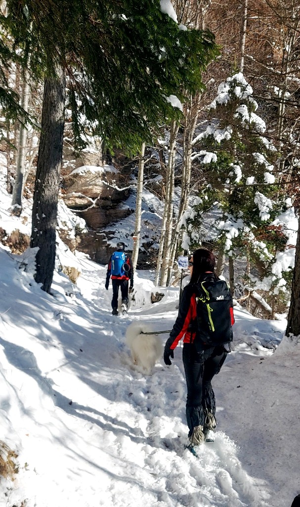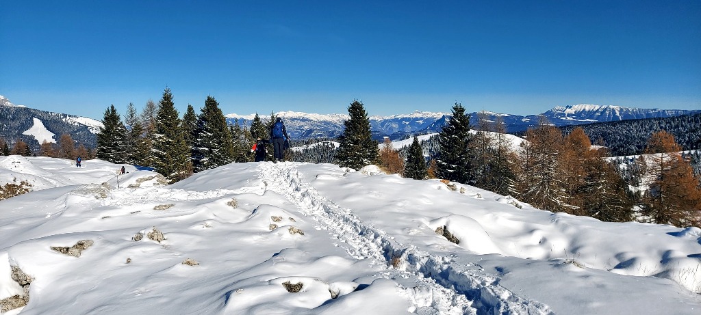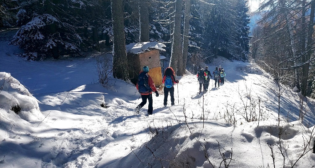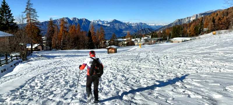 Dopo mangiato si è quindi scesi verso Serrada, camminando fra i soleggiati prati innevati delle piste da sci (preferiti al sentiero ufficiale, che passa nel bosco, all'ombra), che a breve saranno presi d'assalto dagli sciatori.