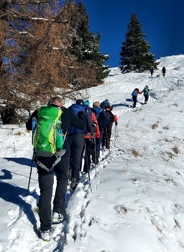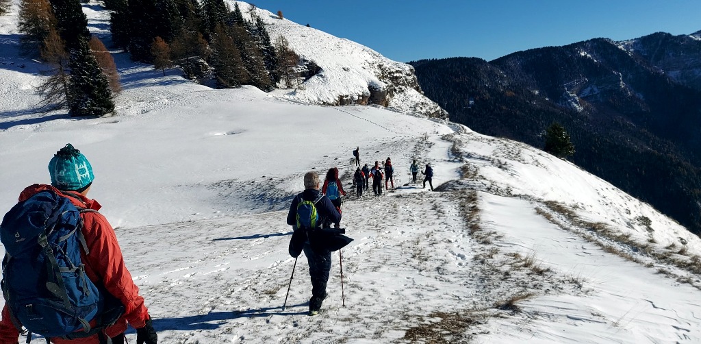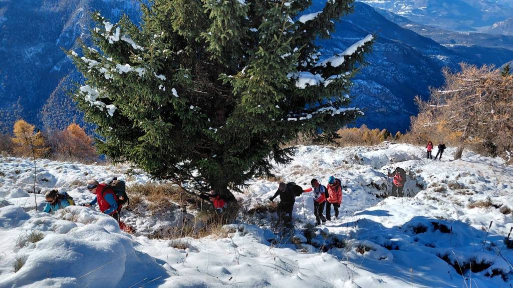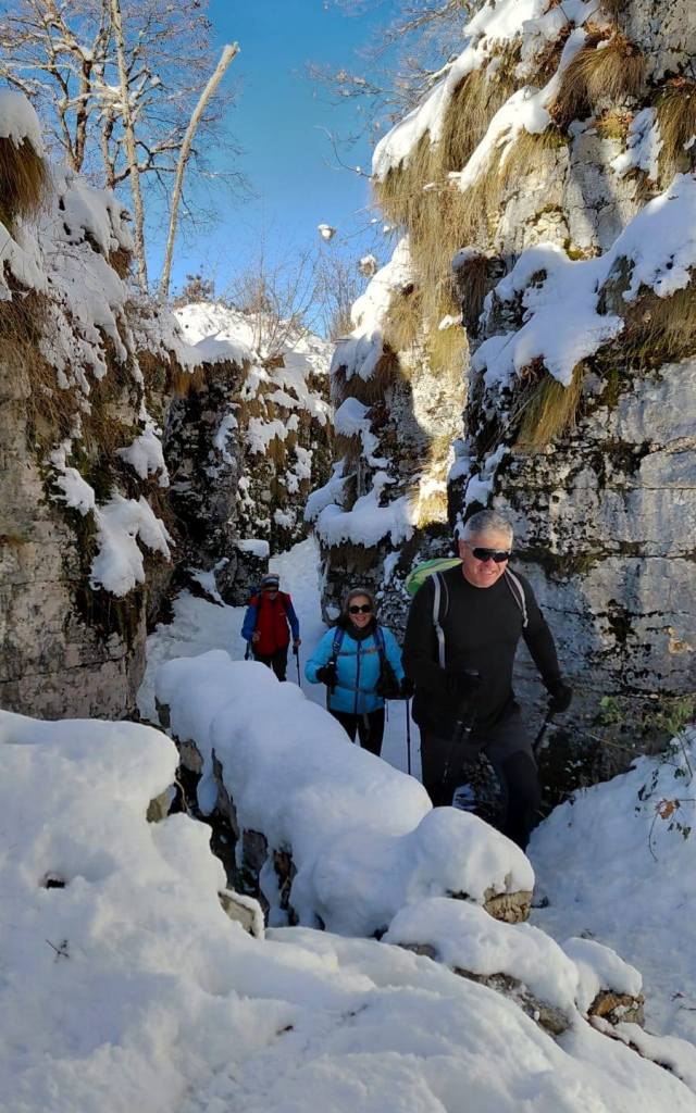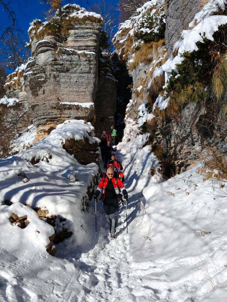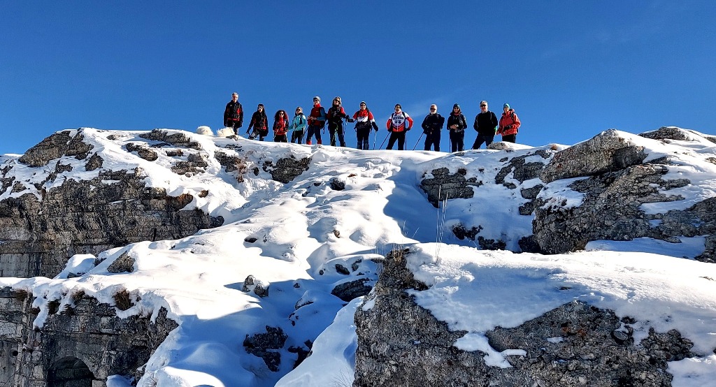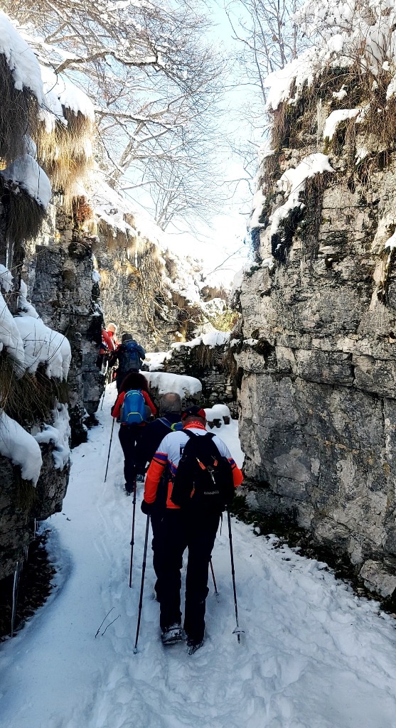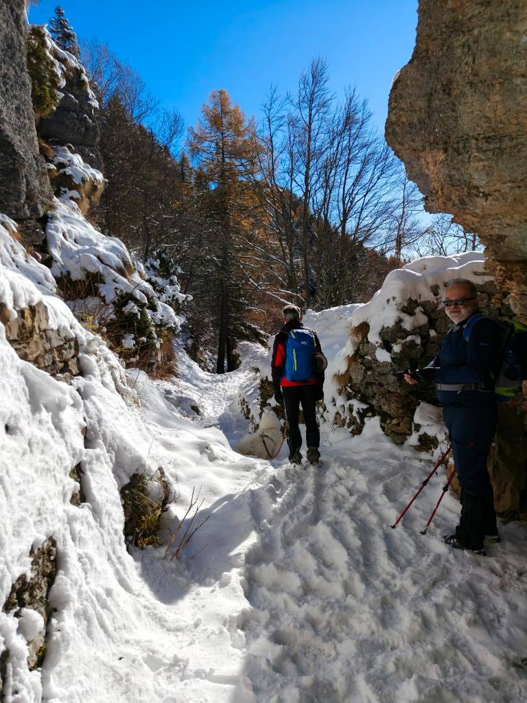 23/11/2025. E' stata disputata oggi sull'Altopiano di Folgaria la 9ª ed ultima uscita del Programma Trekking 2025. L'itinerario previsto era un anello abbastanza breve (9 km) caratterizzato dal passaggio nel sito storico della Forra del Lupo, una lunga sequenza di trincee austroungariche affacciate sulla Val Terragnolo, alcune delle quali ricavate dentro stretti passaggi naturali fra le rocce. Nelle previsioni doveva essere un'uscita caratterizzata dai mille colori del bosco, in veste autunnale, ma la neve caduta nei giorni precedenti ha letteralmente trasformato il paesaggio, cosicchè - oggi - si è celebrato l'ideale passaggio di testimone fra la stagione estivo-autunnale (che se ne va) e quella invernale, che comincia sotto i migliori auspici !.