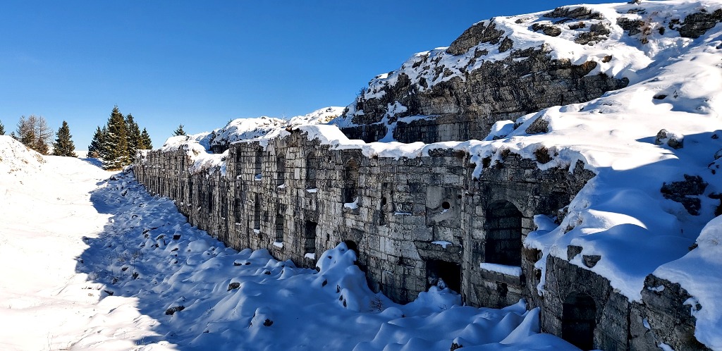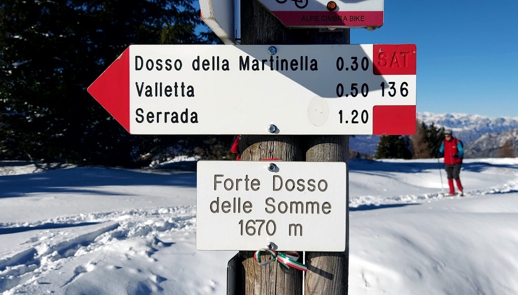 La salita è culminata ai 1670 metri del Forte Dosso delle Somme, una delle tante fortezze che l'esercito austriaco aveva realizzato sugli altipiani cimbri, per contrastare l'avanzata italiana da sud. Come tutti i forti della zona (unica eccezione Forte Belvedere a Lavarone) anche questo è ridotto a rudere ed è visibile solo dall'esterno. Le bombe, prima, i c.d. "recuperanti", dopo, hanno lasciato sul sito solo la scatola esterna ...