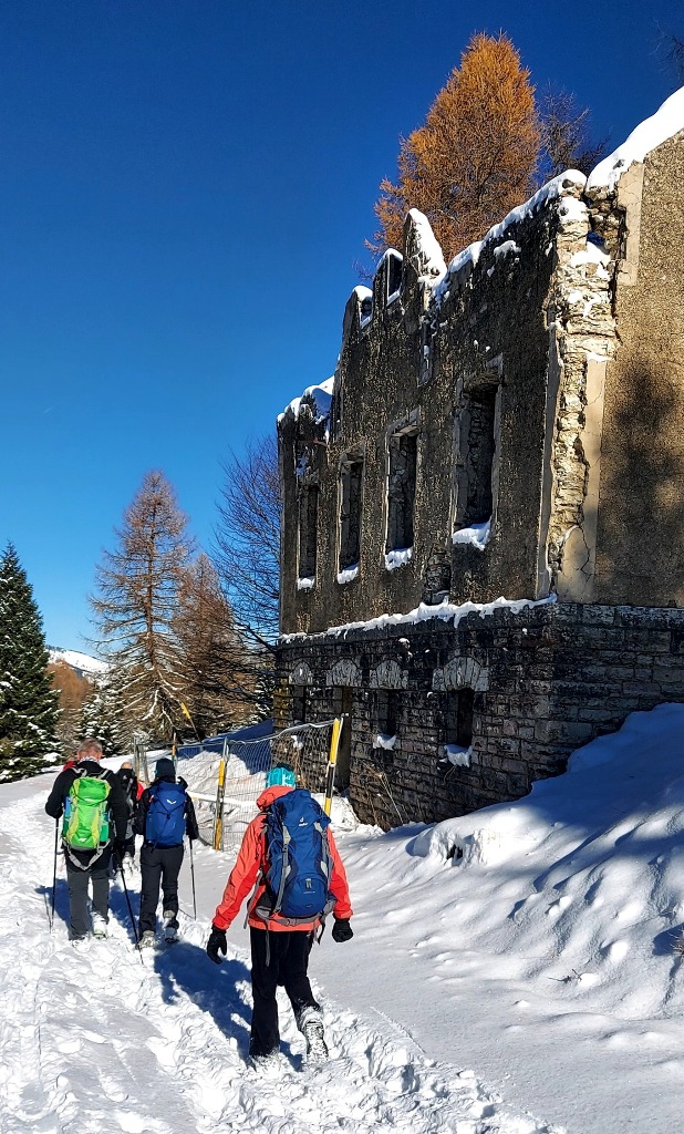 Dal forte, camminando sulla vecchia strada militare e passando a fianco di vecchie caserme diroccate, si è scesi fino al Rifugio Baita Tonda, attualmente chiuso, sulla cui terrazza è stata fatta la pausa pranzo.
