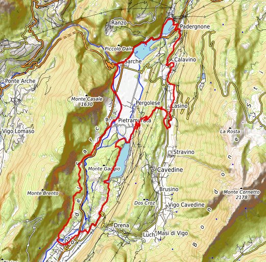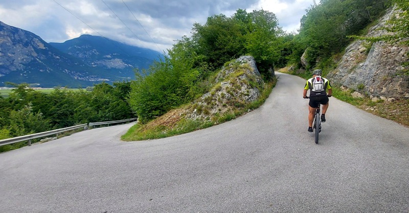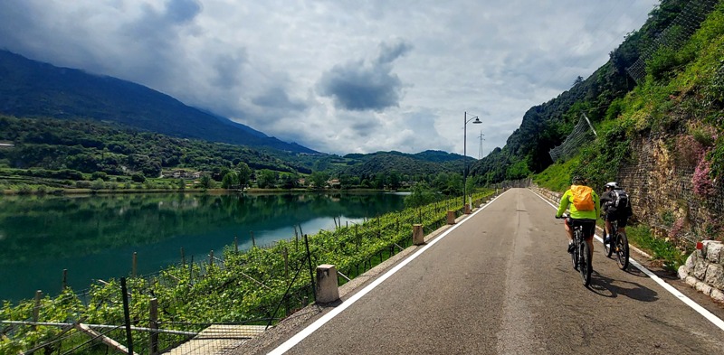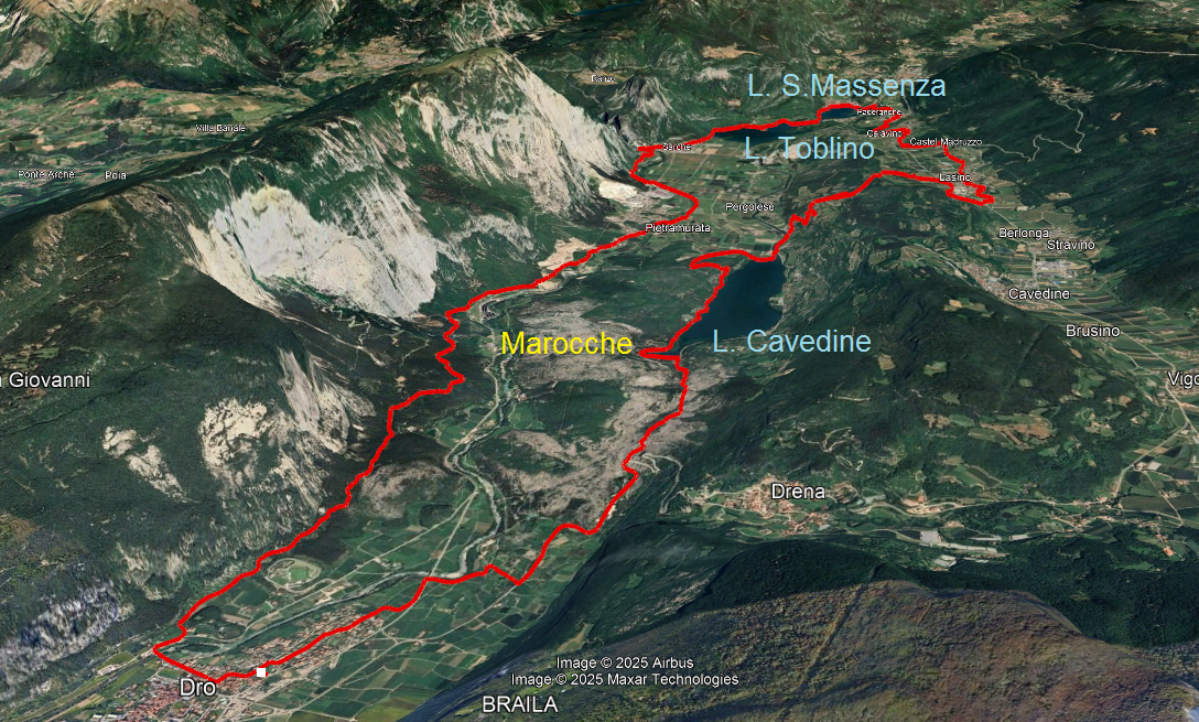 descrizione La partenza in bici è prevista attorno alle ore 9:00. Da Dro, imboccando la pista ciclabile lungo il Sarca, si salirà verso la centrale di Fies, deviando poi sulla provinciale per Drena, fino al bivio per le Marocche. Si attraverserà la zona dell'enorme frana post-glaciale, scendendo poi al lago di Cavedine, che verrà costeggiato sulla sponda ovest (sterrato). Proseguendo lungo il canale Rimone, si arriverà a Pergolese, per poi salire in loc. san Siro, con scollinamento in Valle di Cavedine. Attraversato il paese di Lasino, si salirà a Castel Madruzzo (GPM), per poi scendere a Padergnone. Da qui si raggiungerà il Lago di santa massenza, che verrà costeggiato lungo la strada in sponda ovest, per poi proseguire lungo il Lago di Toblino, fino a Sarche. Qui si riprenderà la ciclabile, per proseguire verso sud, fino a Pietramurata. da lì si andrà su sterrato (dal Ciclamino), passando sotto il Monte Brento, fino a rientrare a Dro, dopo circa 40 km. Dopo la pedalata, spadellata di pasta a casa di ALVARO IL TAVERNA, che proprio quel giorno compirà 69 anni !