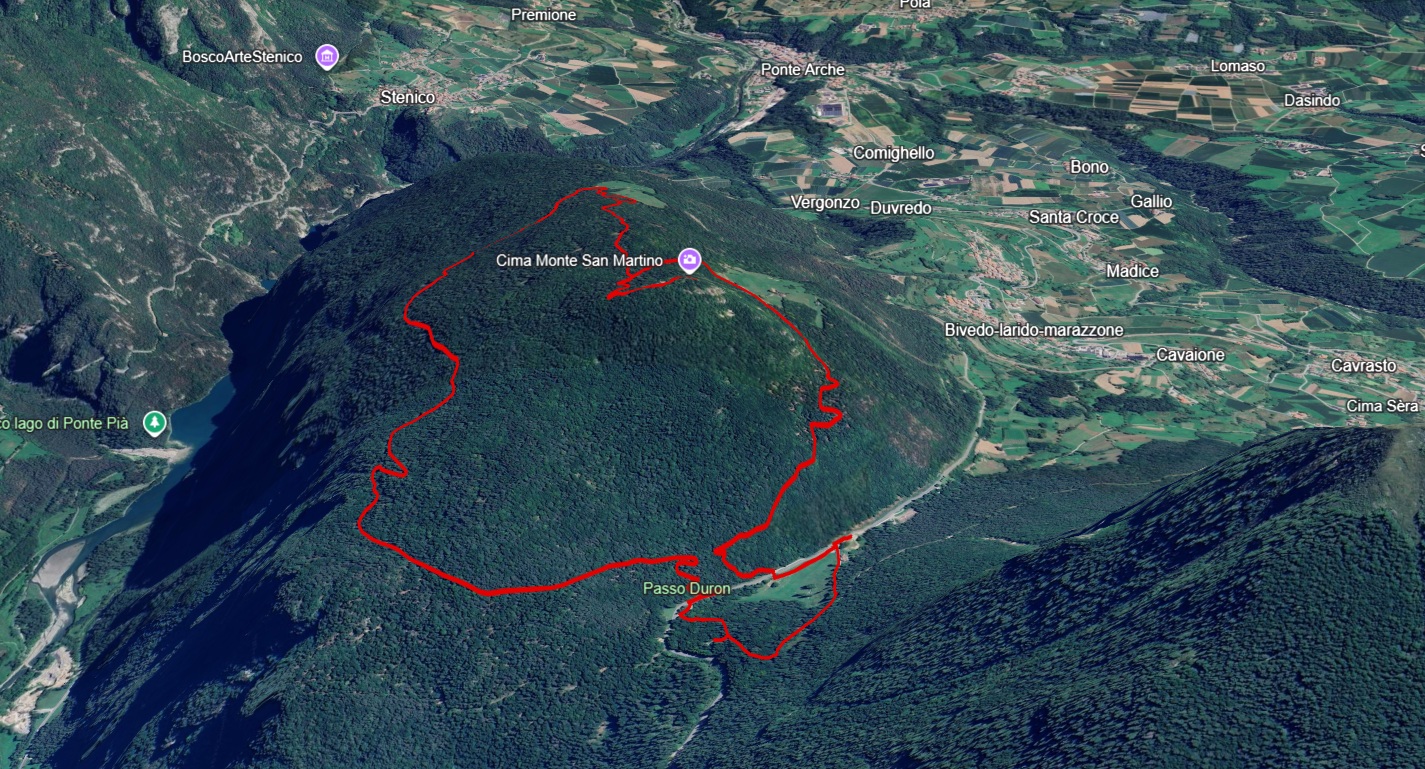 descrizione Partenza da Passo Durone (valico che connette il Bleggio con la "Busa di Tione"). Da lì si imboccherà la stradina forestale che aggira il Monte san martino da nord-ovest, con affaccio sulle valli Giudicarie. Percorrendo tutte le pendici settentrionali del monte, si arriverà a Prà del Buedi (m.1225), bellissimo pascolo con caratteristiche baite in legno/pietra e splendida vista sul Brenta meridionale. Da lì, imboccato il sentiero 465, si punterà dritto alla cima del Monte San Martino, GPN dell'itinerario a quota 1450. La discesa avverrà dal versante sud, arrivando al Prà Marani, altro bel pascolo con vecchie baite. Proseguendo sul sentiero 465, si rientrerà a Passo Duron, dopo circa 10 km di cammino. GPM a Monte San Martino, m.1450. |